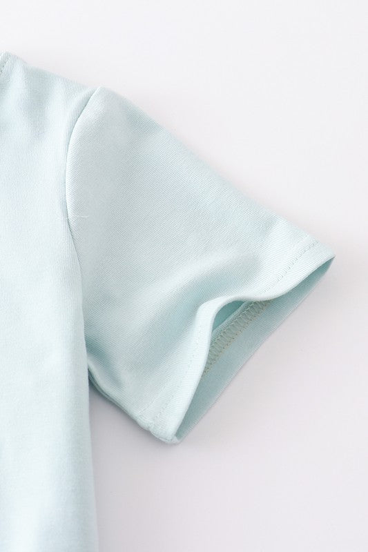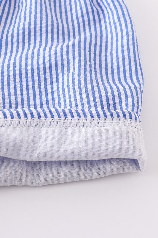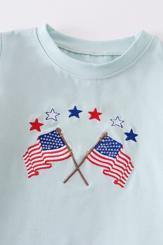 This Blue patriotic flag embroidery boy set is the perfect way to show your pride! The stars, stripes and our flag flying high it's all there on this classic American design. Dress to impress while staying comfortable with this favorite flag style. Go USA!!